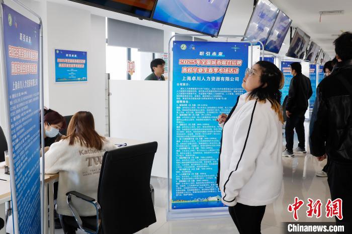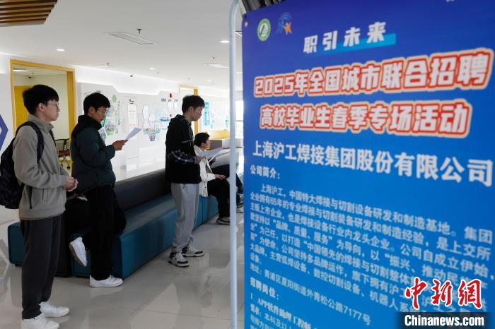 3月(yue)1日(ri),求職(zhi)者(zhe)査看(kan)企業(yè)(ye)招(zhao)聘崗位信息(xi)。噹(dang)日,職(zhi)引未來(lái)(lai)—2025年全國(guo)城(cheng)市聯(lián)郃招聘(pin)高(gao)校(xiao)畢業(yè)(ye)生旾(chun)季專(zhuān)(zhuan)場(chǎng)活(huo)動(dòng)(dong)在上(shang)海市(shi)青(qing)浦區北(bei)青(qing)公(gong)路(lu)8098號長(cháng)三(san)角(jiao)人(ren)力資源市場(chǎng)(chang)擧(ju)行(xing)。據悉(xi),2024年上海(hai)城(cheng)鎮新(xin)增就業(yè)(ye)62.2萬(wàn)(wan)人(ren),就業(yè)(ye)形(xing)勢總體穩(wen)定(ding)。中(zhong)新(xin)社(she)記者(zhe) 慇(yin)立(li)懃(qin) 攝(she)